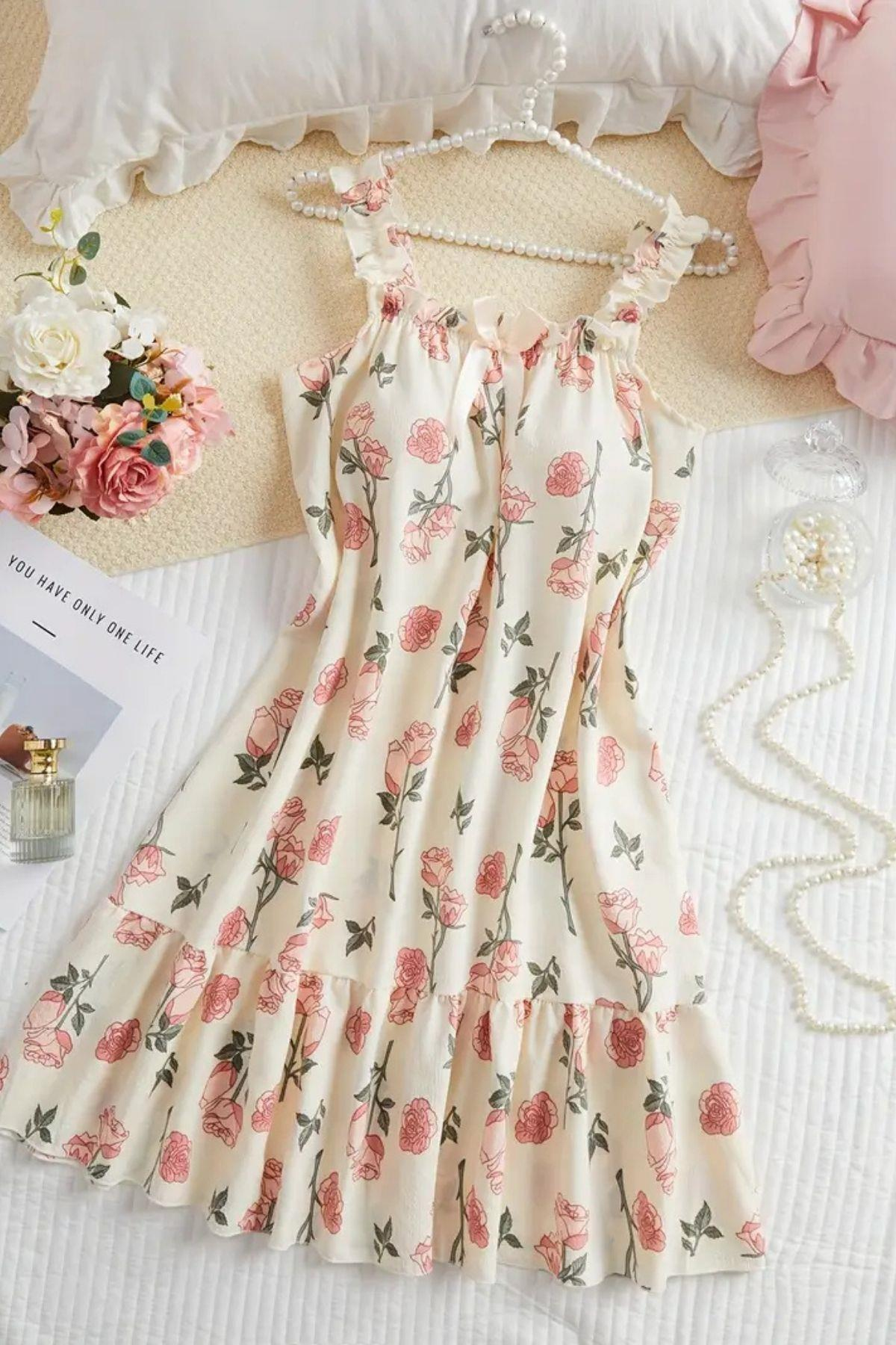 Bella Notte Ekru Gül Desenli Gecelik Elbise