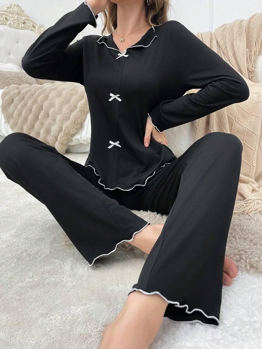 Bella Notte Siyah Uzun Kollu Fiyonk Detaylı Pamuklu Şık Pijama Takımı 7349
